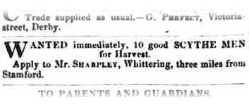 There’s not a lot going on in this clipping, but we can try to draw some assumptions from just these few words. The ad asks for applications to be made to a Mr. Sharpley of Whittering. We can’t be certain, but there’s a possibility this Sharpley would be the employer of these scythe men. If true, Sharpley would be a landowner in the village. Advertising vacancies for ten scythe men not only suggests a large tract of land needs to be harvested, but also that the employer possesses the financial means to employ ten people.