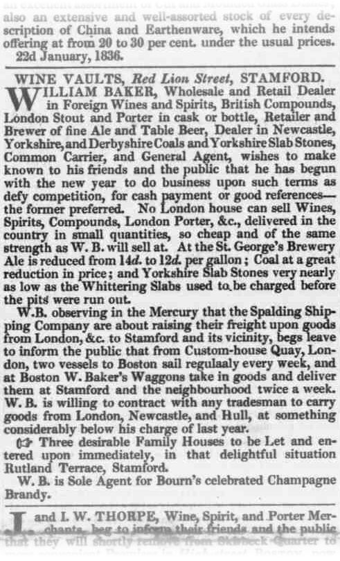 Here’s another example – an advertisement promoting the wares and services of William Baker’s Wine Vaults on Red Lion Street in Stamford: