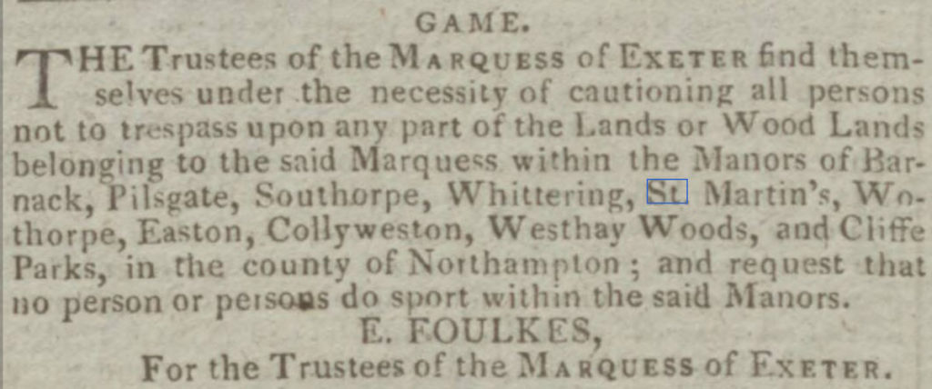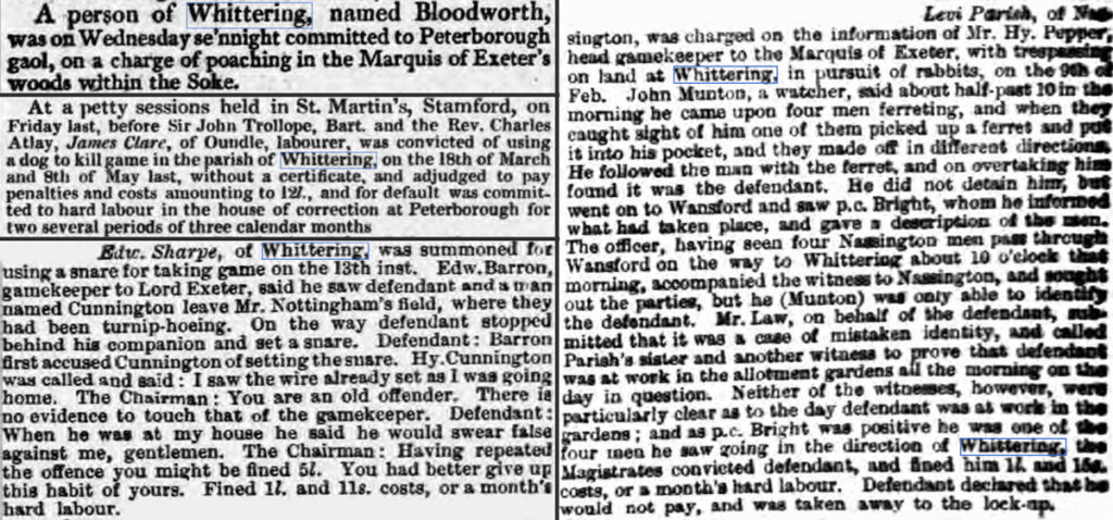 Reports of poaching in Wittering appeared several times throughout the 19th century. The Marquis of Exeter was the principle landowner in the region. As such, had the power to impose game laws on lands under his ownership. The clipping below is from 1807, and serves as a caution to anyone looking to ‘do sport’ within the listed lands, including Wittering.