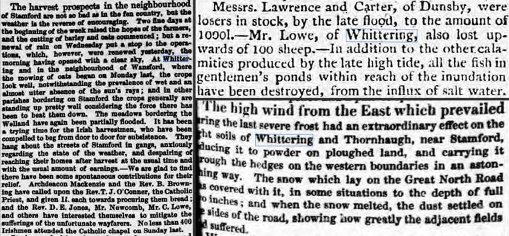 The article in the Stamford Mercury from 1860 describes the poor prospects for that year’s harvest, with knock-on effects on the Irish migrant labourers who would typically work on fields in the region. Meanwhile, inclement weather in preceding decades had a noteworthy impact on the condition of farming land and livestock, with Mr. Lowe of Wittering losing over 100 sheep to high tide flooding in December 1810.