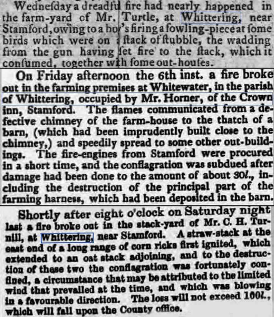 Above are three examples of fires occurring on farmland in Wittering. In an age without motorised travel and speedy response from emergency services the risk of fire causing substantial damage to farm property was substantial. The damage from the final example was estimated to cost £160, almost £20,000 in present day when adjusted for inflation‡.