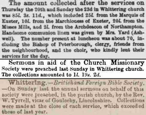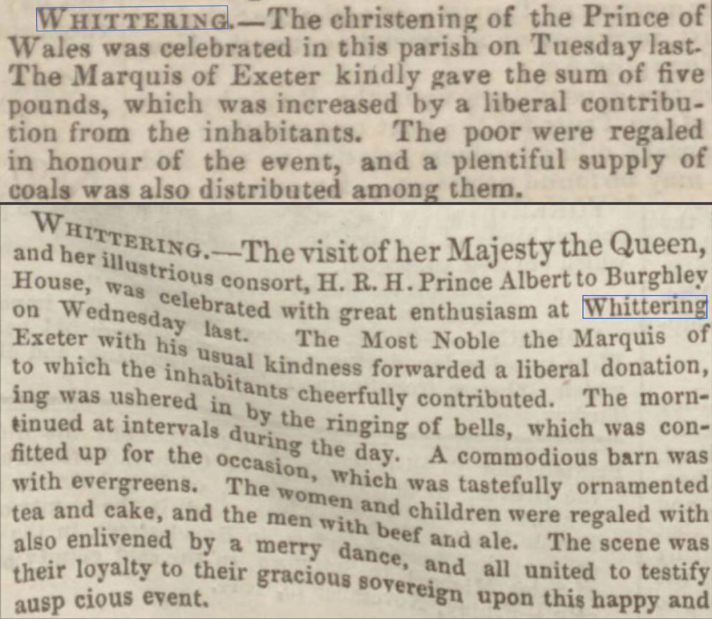 Royal occasions were a cause for celebration in the village. The two clippings above, from two years apart, detail the celebration of the christening of the Prince of Wales in 1842 and the visit of Queen Victoria and Prince Albert to Burghley House in 1844 respectively. On each occasion the Marquis of Exeter made a donation to the parish, with further contributions from inhabitants of the village. In the case of the former occasion it seems the donations were used to make an offering to the local poor.