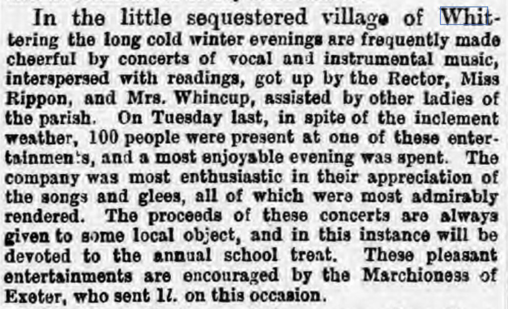 Finally, we have this article from February 1881, which describes regular winter concerts organised by the Rector, Miss Rippon (then the school headmistress) and Mrs. Whincup (wife of farmer Henry Whincup). It isn’t clear where the concerts are hosted, but around a hundred people were pleasant at this particular event despite poor weather. The concerts were also a fundraising opportunity and were in turn encouraged by the Marchioness of Exeter.